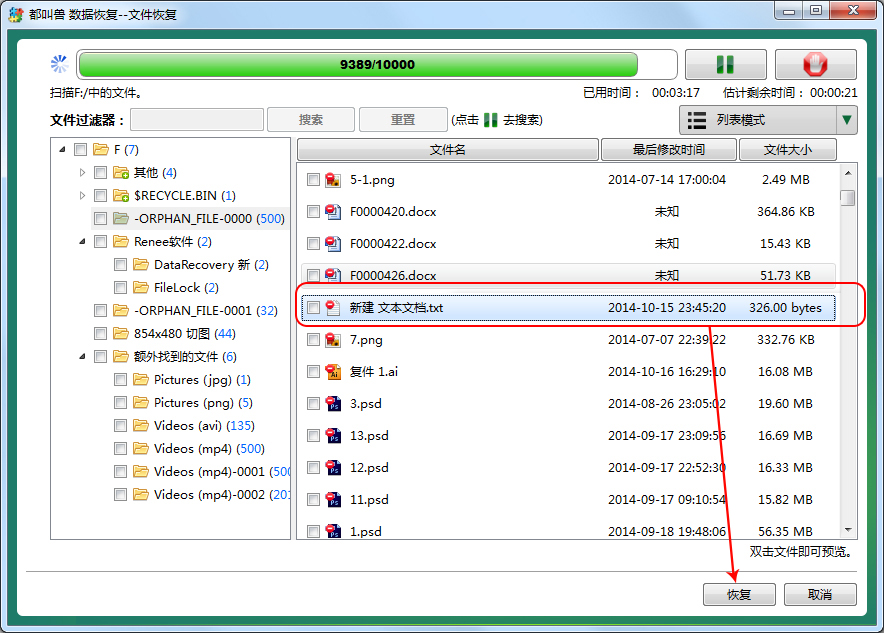 步骤4:等待扫描完成,您可以双击文件进行预览,然后勾选需要恢复的文件,点击【恢复】按钮,将文件恢复到其他磁盘中。