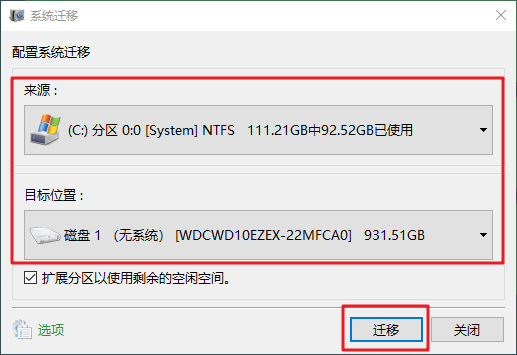 步骤2:接下来,在弹出的“系统迁移”窗口中选择来源和目标位置,来源一般默认选择系统盘,目标位置请选择预更换的硬盘,选择完成之后点击【迁移】按钮即可执行系统迁移的命令。您只需耐心等待,待系统迁移进度条显示为100%,表示系统迁移成功。系统迁移成功之后,您可将旧硬盘拆除,将新硬盘安装到电脑中,再进入BIOS将新硬盘设置为第一启动项。