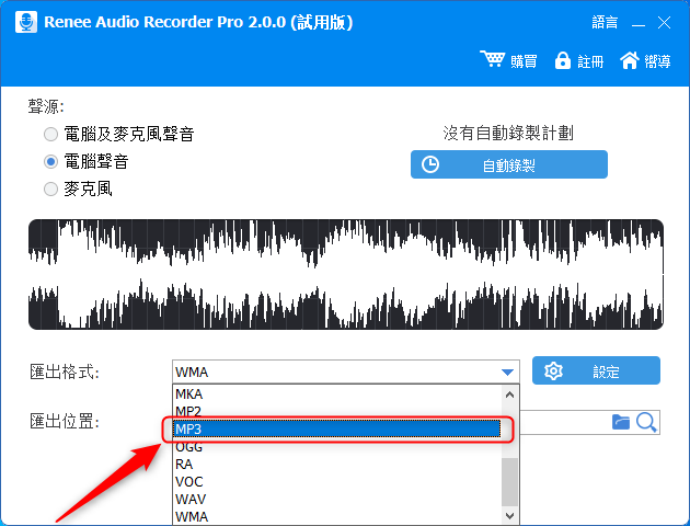 ② 打开Renee Audio Recorder Pro,将声源选择为“电脑声源”,将汇出格式更改为MP3格式并确认好汇出位置。