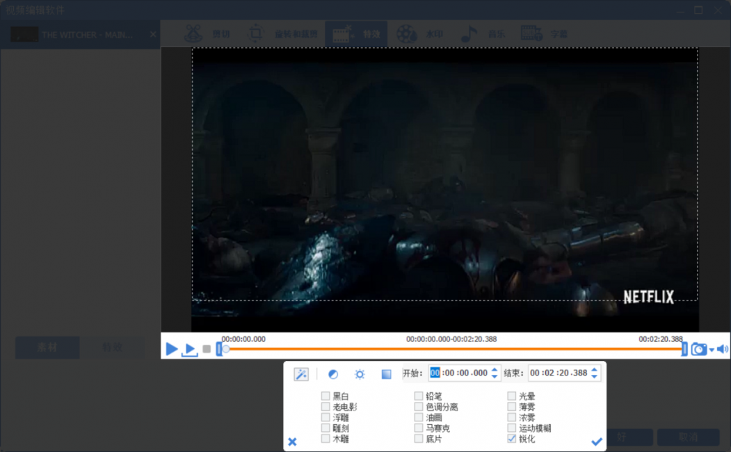 6、除了修改参数外,我们还可以借助这一软件给视频添加滤镜,添加完成后在滤镜选项中,可以选择“锐化”,调节锐度,提高视频的清晰度。