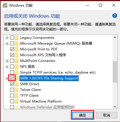 步骤2:找到并勾选【勾选SMB 1.0/CIFS File Sharing Support】选项,之后点击【确定】按钮。