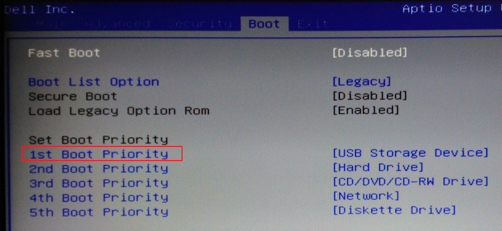 步骤3:将创建好的启动设备连接到需要备份和转移数据的戴尔电脑上,开启电脑,之后电脑屏幕上会显示进入BIOS的快捷键(此界面显示的时长很短,可能只有一两秒),连续点击BIOS快捷键以进入BIOS设置界面,之后可在【Boot】标签栏中将启动U盘设置为启动顺序的首位(1st Boot Priority),之后保存设置并重启电脑。