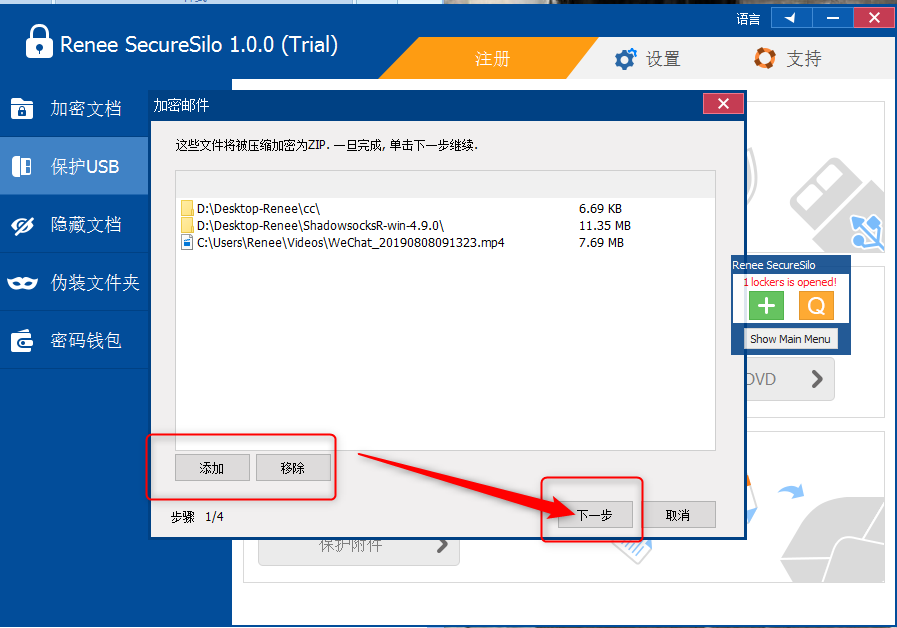 (2)添加之前加密过的文件或者想要发送的文件后点击下一步。