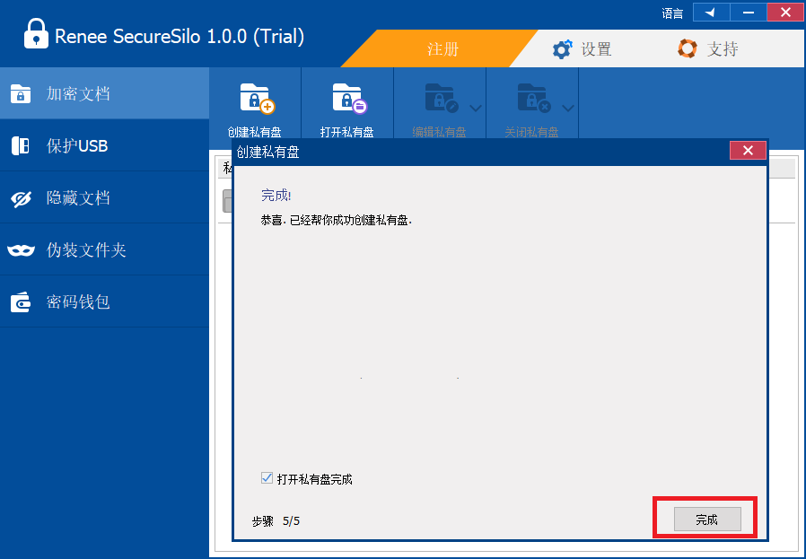8.稍等片刻后,即可成功创建私有盘,点击完成按钮即可。