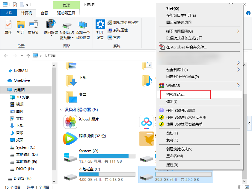 步骤3:打开文件资源管理器,右键单击SD卡驱动器,然后选择【格式化】。