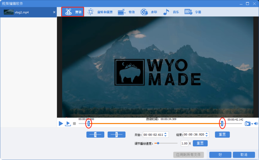 ③ 点击【剪切】。您可移动滑块确定视频的开始时间点与结束时间点,进行视频剪切。另外,您也可调节视频播放速度,调节倍速。