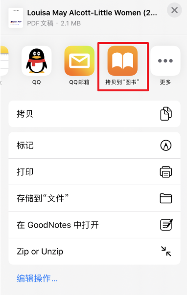 在Safari浏览器中或“文件”程序,打开PDF文件,然后点击分享按钮,选择【拷贝到“图书”】即可将PDF导入iBooks(图书)。