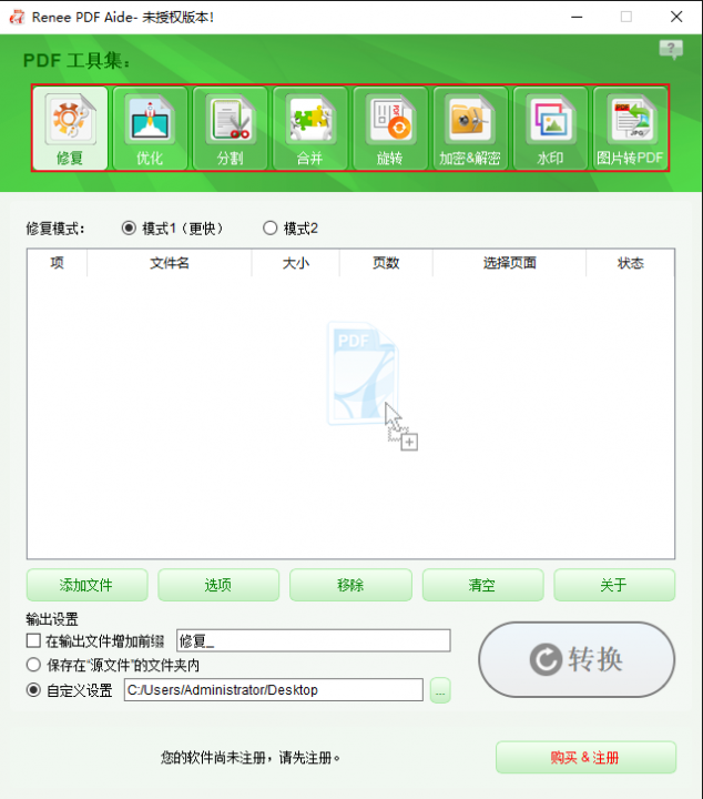步骤2:在顶部功能菜单栏里,您可以选择任一功能栏对PDF文件进行个性化的编辑操作,比如修复、优化、分割、合并、旋转、加密/解密、水印、图片转PDF。此外,您还可以批量编辑PDF文件,方便快捷。