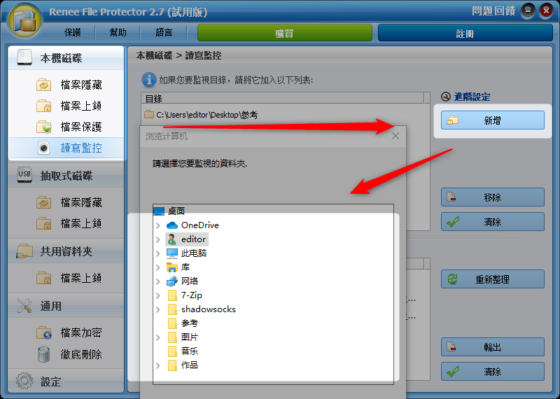 a) 在软件界面右侧功能栏中找到“本机磁碟”→选择“读写监控”,打开操作界面。点击界面右侧的“新增”,上传需要进行读写监控的文件/文件夹,以监控目标对象的一切更改情况。
