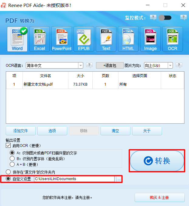 步骤5:在转换的时候还可以选择【启用OCR】模式,在OCR模式下,我们需要选择文档对应的OCR语言,这样可以大大提升字符转换的识别率。