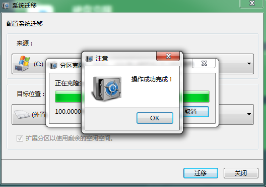 步骤3:操作完成之后,点击【OK】即可完成将系统安装到固态硬盘的操作,非常的方便。之后您需要进入BIOS或者UEFI中将新的固态硬盘作为第一启动项,重启电脑即可从新固态硬盘启动并进入系统。