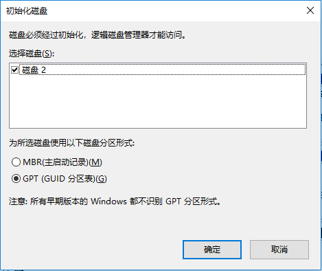 步骤4:按照默认设置,并点击【确定】。点击【确定】后,磁盘的标志会改为【联机】。也可点击此处了解磁盘分区形式MBR和GPT的区别。
