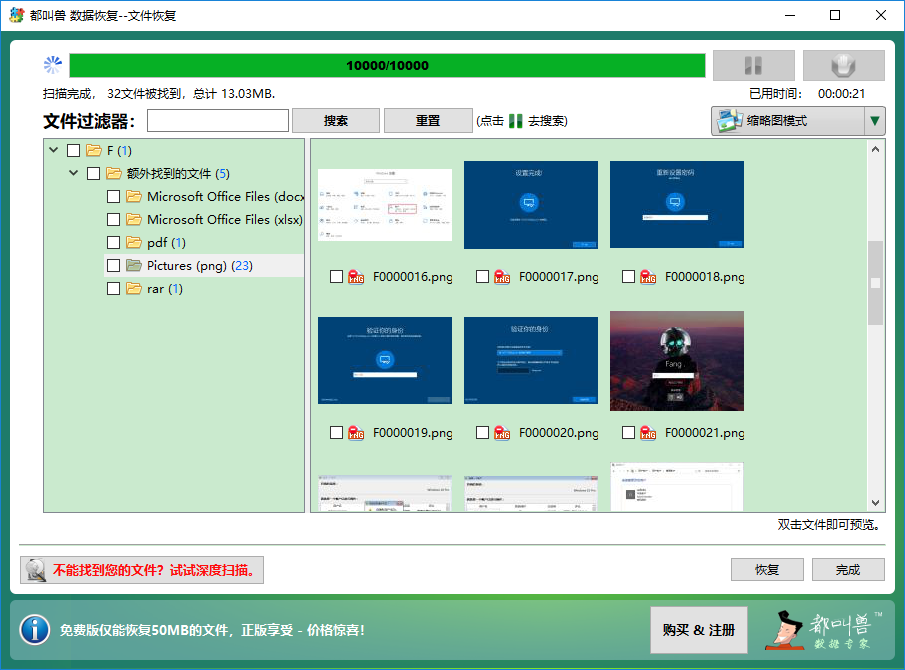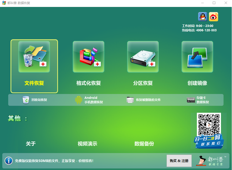 都叫兽™数据恢复软件是一款专门用于恢复系统数据文件的软件,当您不慎误删了重要文件,清空了回收站,或者是格式化了磁盘/存储器,都可以借助该工具将丢失的数据找回。该软件涵盖了四大功能模块,即包含文件恢复、格式化恢复、分区恢复和创建镜像,可以帮您全方位地解决所有数据丢失的问题。此外,该软件还采用了强大的指纹技术及文件系统重建技术,可以绕过SD卡中损坏的块(Block),重建SD卡文件系统,帮助您最大限度找回SD卡中完好的数据文件,非常的方便。