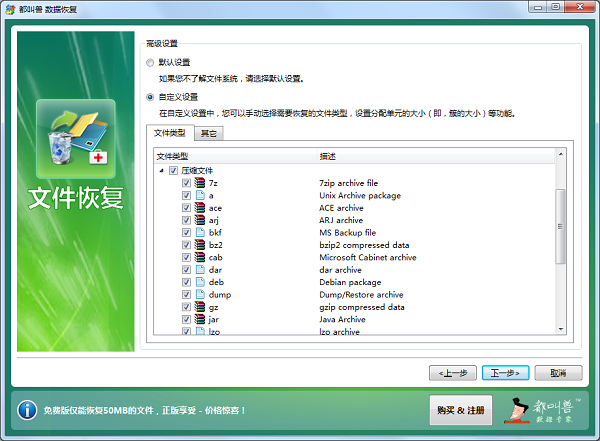 现在我们是要寻找压缩文件,所以点击“自定义设置”并勾选“压缩文件”。里面包含了大部分的压缩文件格式供您选择。
